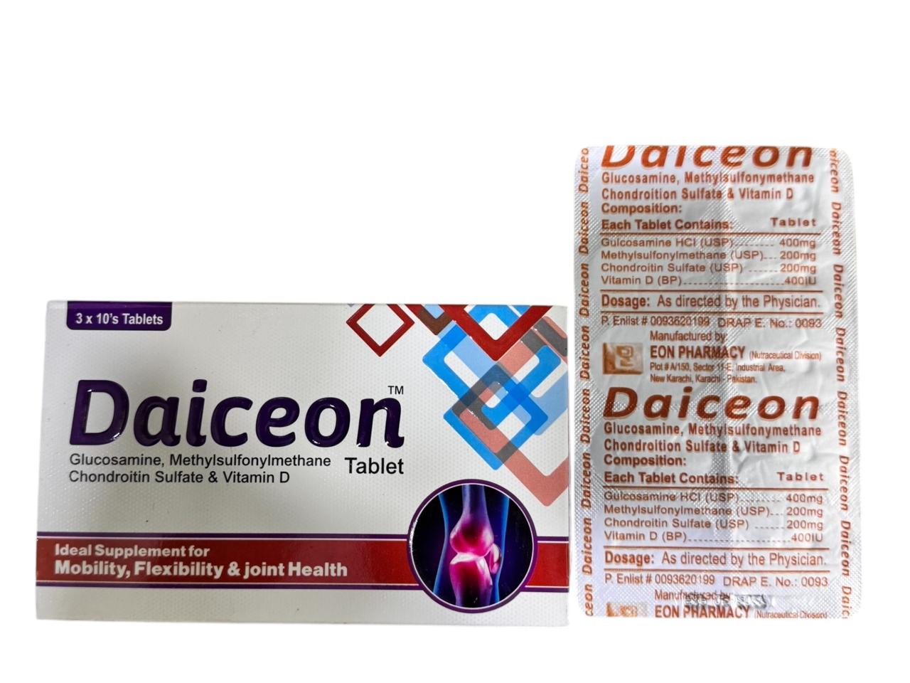 Daiceon Tablets  contains : Glucosamine 400mg . Chondroitin Sulphate 200mg , MSM 200mg  , Vitamin D 400 IU . Indications : Muscle spasms , Rheumatic pain , Osteoarthritis , Frozen shoulder , Cramps & Bruises .
